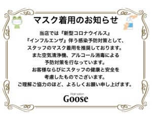 新型コロナウイルス・インフルエンザに伴う予防対策としてスタッフにマスク着用を推奨しております